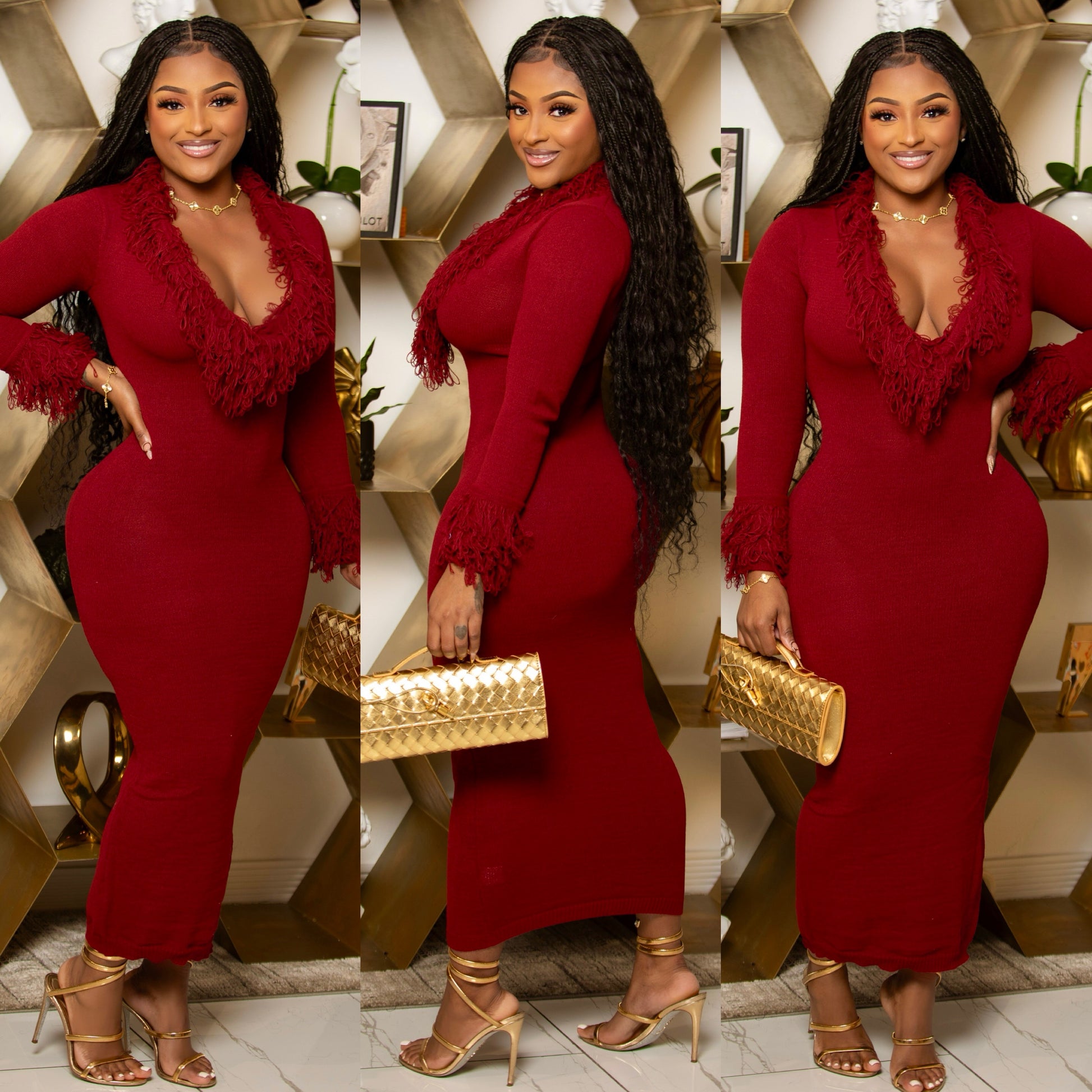 V Neck Long Sleeve Unlined SemiSheer (can be sheer when stretched) Maxidress Pull on Straight hem Slim Fit / Close to the body, slightly less tight than bodycon Some Stretch 95%POLYESTER 5%ELASTANE Tassel neck & cuffs Imported Hand wash with cold water, hang dry. Do not Bleach